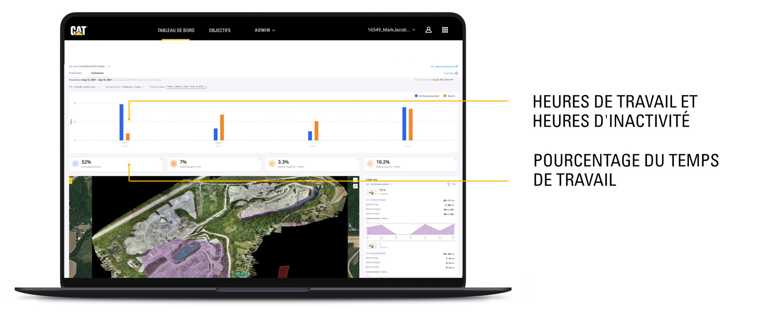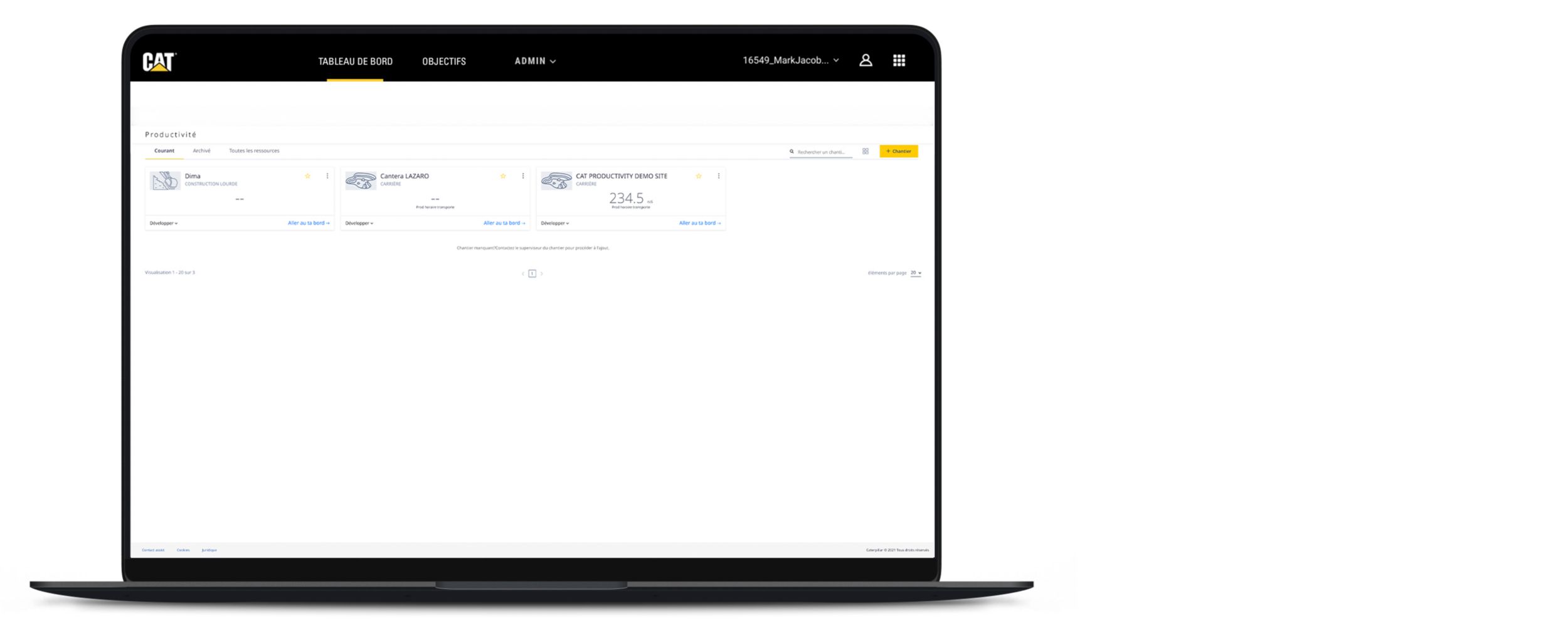 Cat Productivity a été conçu pour cela. Les informations sur les chantiers vous permettent de voir rapidement et sur le même écran un résumé de plusieurs chantiers et des mesures de haut niveau. Au bureau ou en déplacement, si vous disposez d'un appareil compatible avec le web et d'une connexion Internet, vous avez accès aux informations.